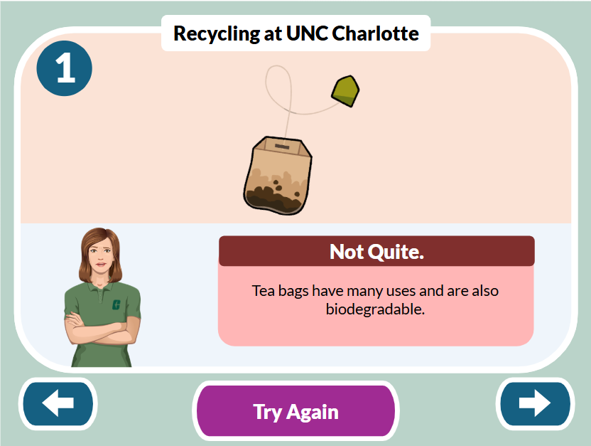 To retain this engaging element in the online version, I designed an interactive sorting activity using Articulate Storyline. I also used Google Slides to create custom visuals, such as the dumpster, to make the activity more visually appealing and immersive. Additionally, I sourced royalty-free sound effects and songs from SoundBible and Incompetech. When interacting with the game, the learner is provided with immediate feedback to increase engagement and content mastery. Additionally, the learner is provided with campus resources for further exploration.